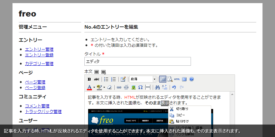 記事を入力する時、HTMLが反映されるエディタを使用することができます。本文に挿入された画像も、そのまま表示されます。
