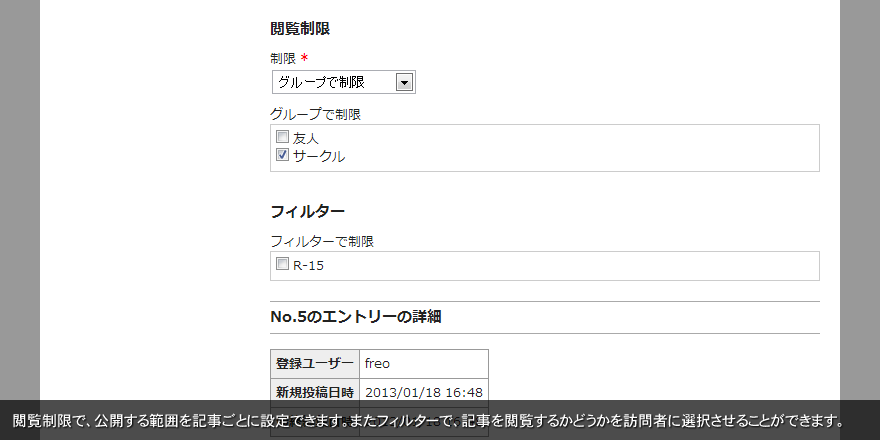 閲覧制限で、公開する範囲を記事ごとに設定できます。またフィルターで、記事を閲覧するかどうかを訪問者に選択させることができます。