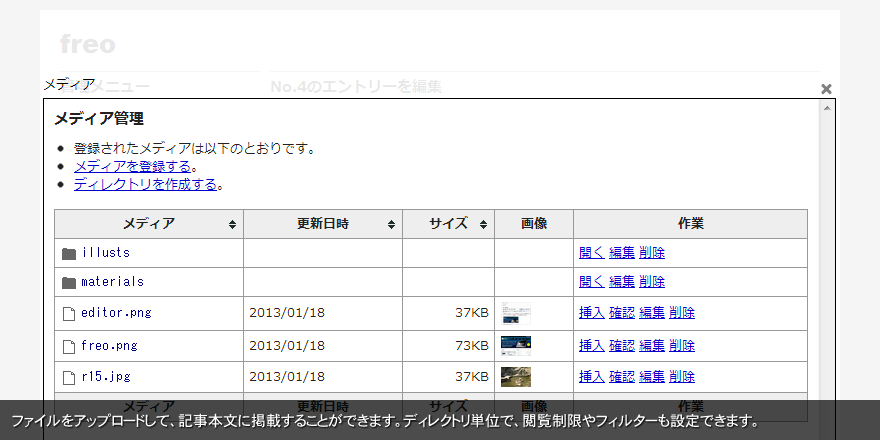 ファイルをアップロードして、記事本文に掲載することができます。ディレクトリ単位で、閲覧制限やフィルターも設定できます。